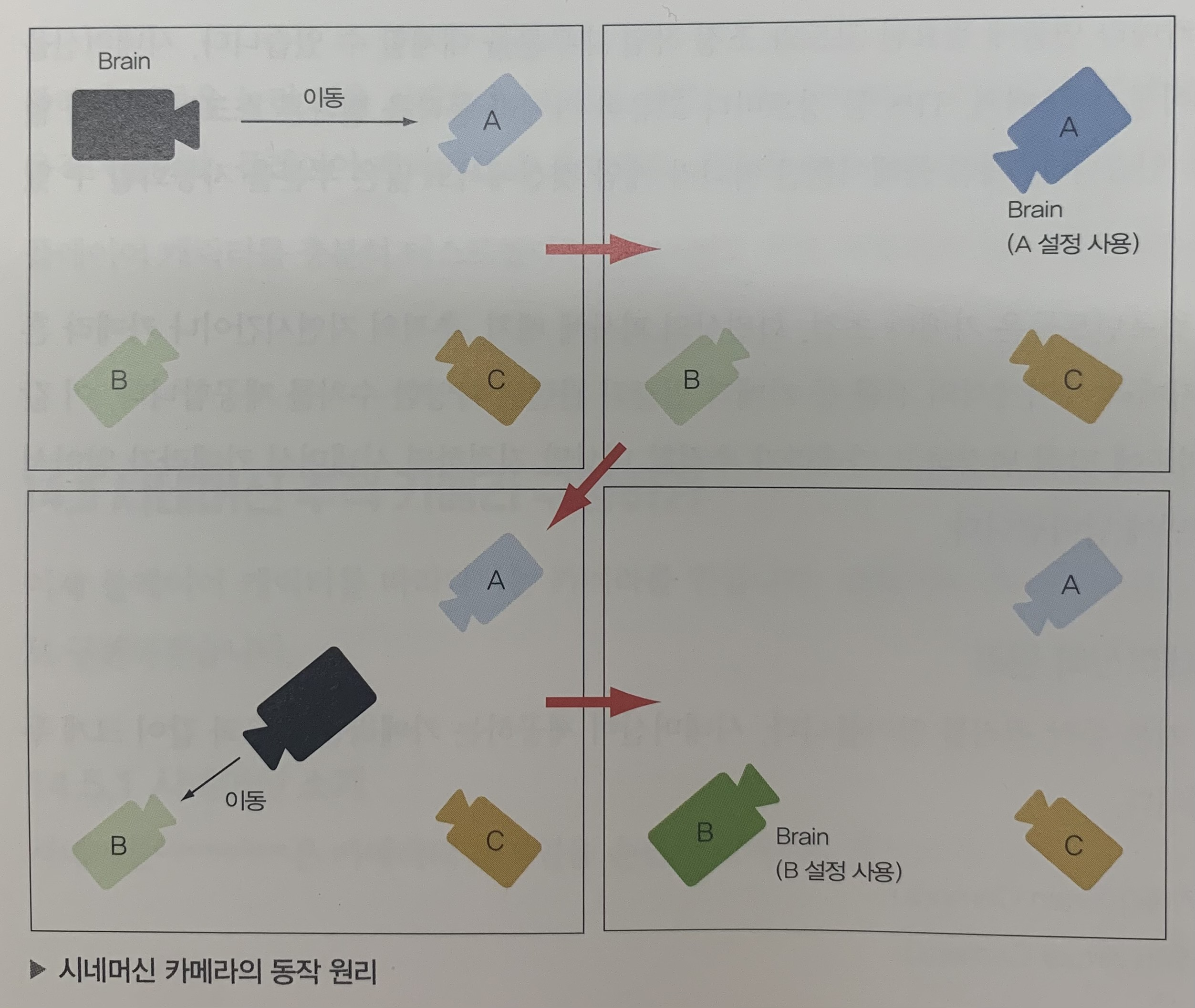 시네머신의 원리 : 시네머신은 브레인 카메라와 가상 카메라로 나누어지는데 브레인 카메라는 씬에 하나만 존재하며, 가상 카메라는 브레인 카메라의 분신 역할로 씬에 여러 개 존재 가능.